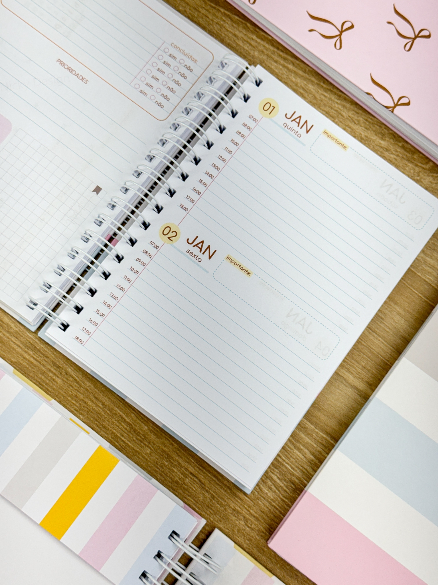 Experiência do Usuário: Ao abrir sua Agenda A5 2026, você será recebido por uma página de apresentação que lhe permite personalizá-la com seus dados. O papel de alta qualidade proporciona uma escrita suave, evitando borrões e garantindo uma experiência agradável ao fazer anotações.