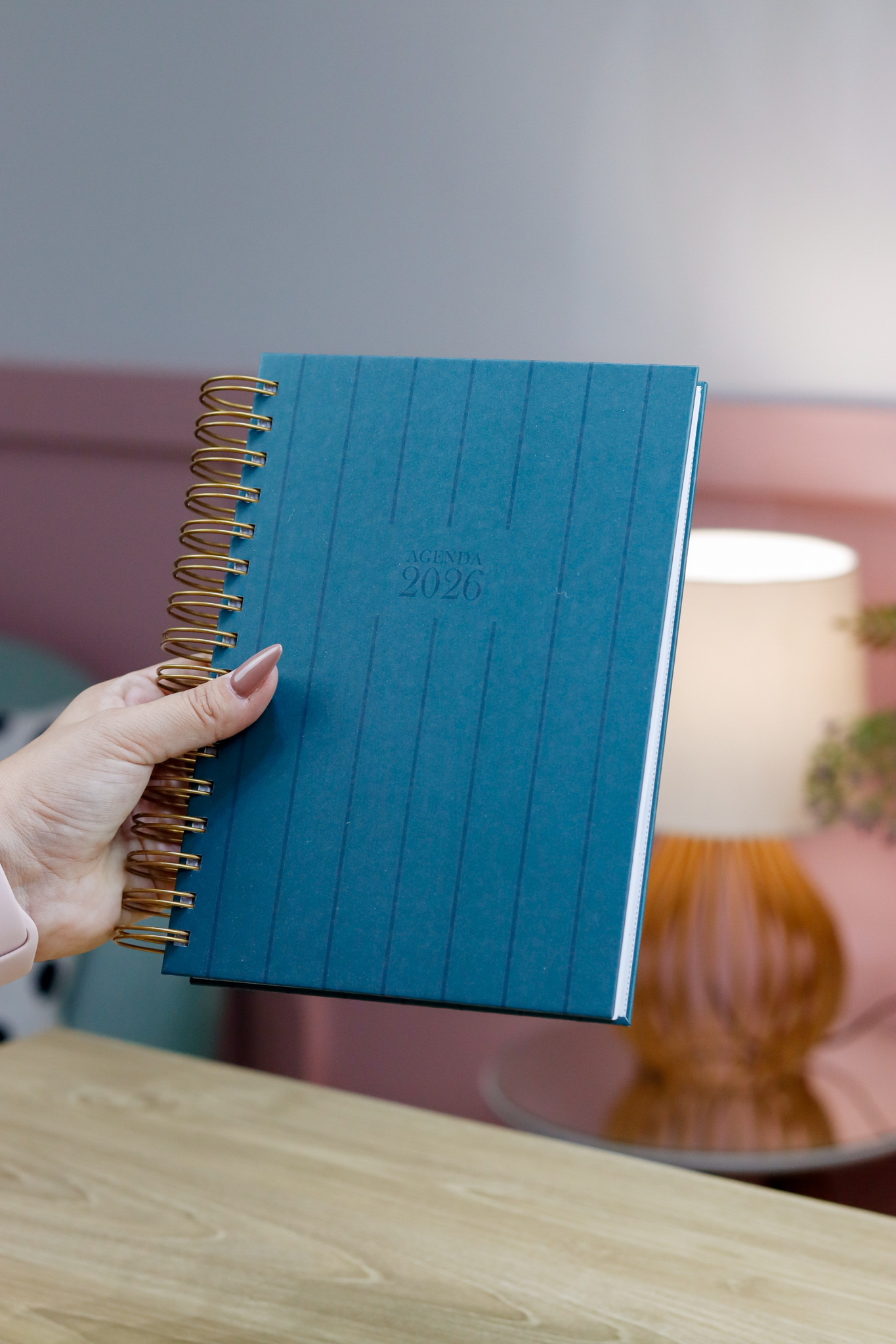 • Página de dados, calendário 26 - 27, lista telefônica, logins e senhas, controle de saúde, planejamento anual, metas do ano e controle financeiro de Jan a Dez.