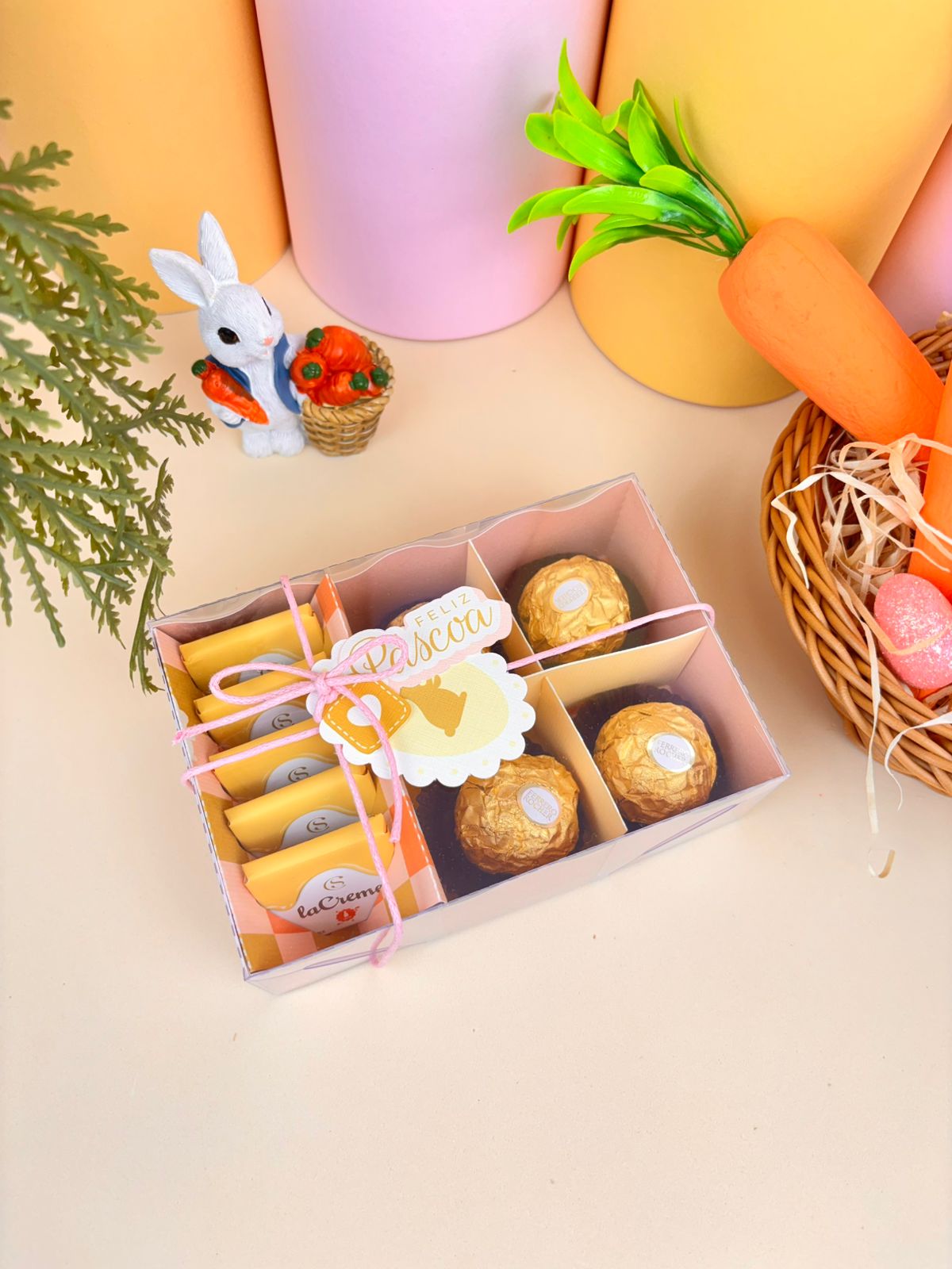 Use para presentear em ocasiões especiais como Páscoa, aniversários ou encontros. O box pode ser reaproveitado para guardar pequenos objetos ou doces. Recomenda-se conservar longe da umidade para preservar a qualidade do papel e acetato.