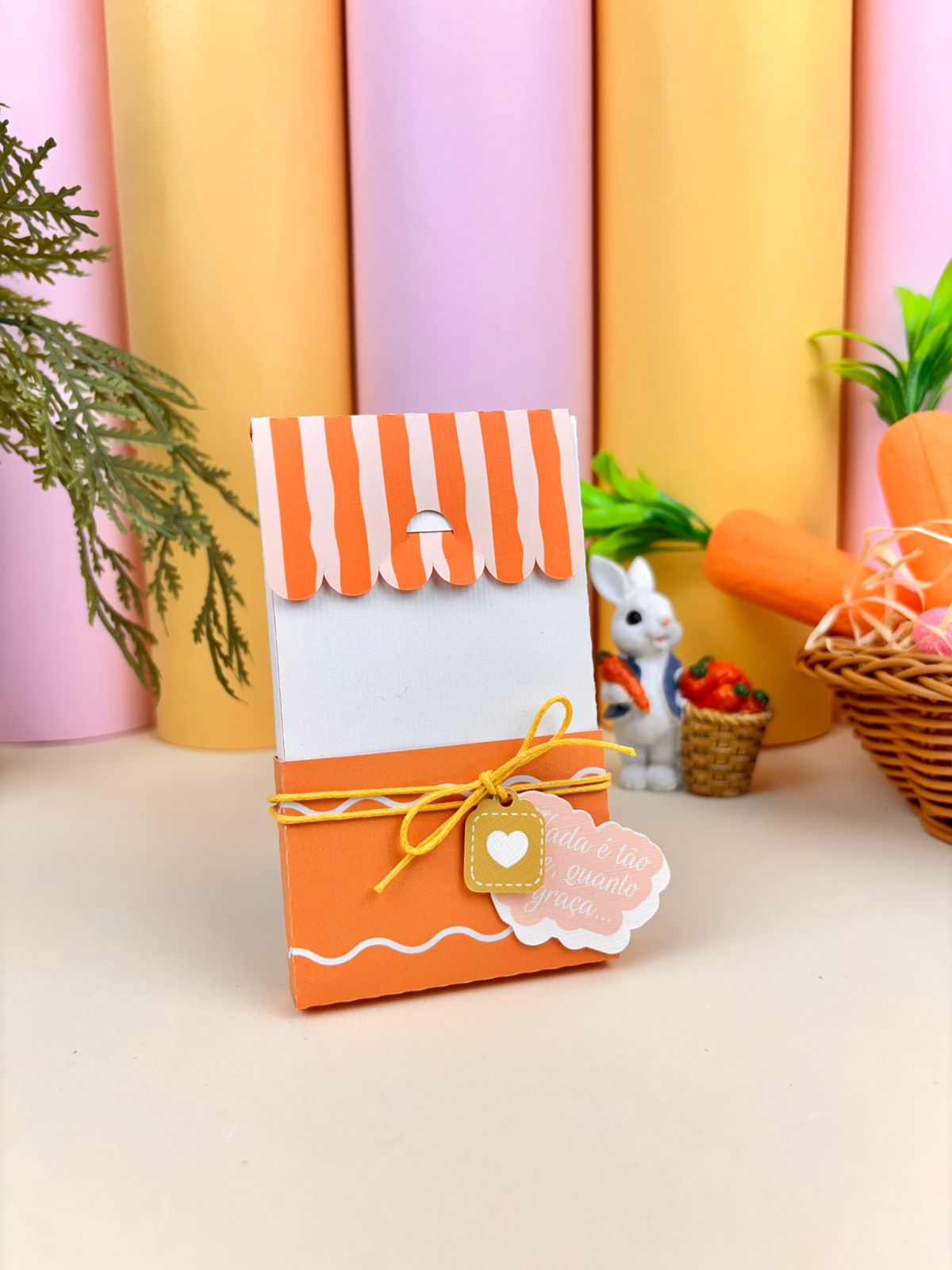 Feita com papéis de gramatura 180g, que oferecem boa durabilidade e toque sofisticado. O cordão encerado amarelo garante um acabamento delicado e seguro, combinando com a paleta de cores do box. O formato é pensado para acomodar uma barra Kit Kat padrão com facilidade, proporcionando um embrulho diferenciado sem complicação.