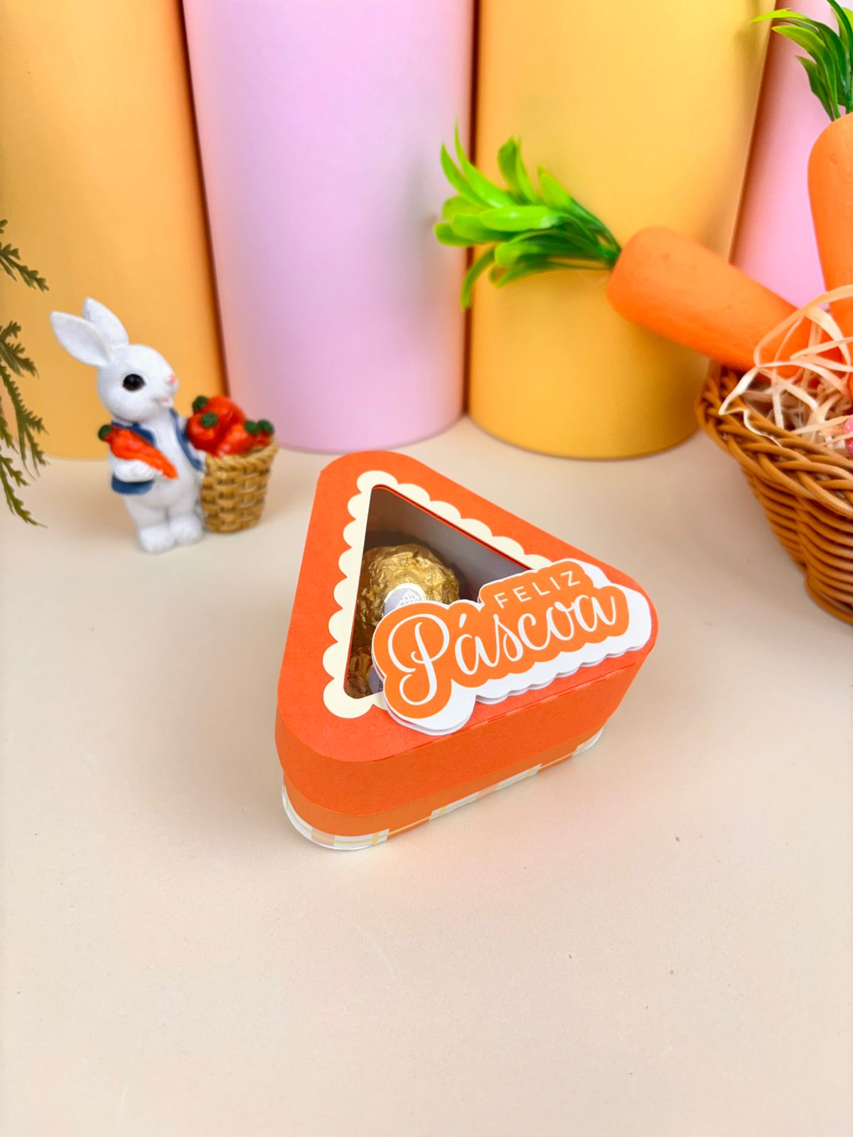 O box triangular é produzido com papel opaline diamante telado de 180g, garantindo rigidez e acabamento refinado. A janela em acetato de 20 micras oferece proteção e exibe o conteúdo, valorizando doces ou pequenos alimentos. A cor cenoura deixa o design atrativo especialmente para eventos temáticos.