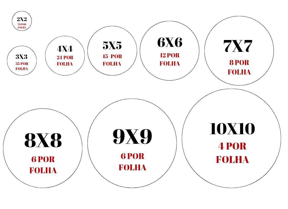 Disponível em diversos tamanhos de círculos e quadrados: 2x2, 3x3, 4x4, 5x5, 6x6, 7x7, 8x8, 9x9 e 10x10